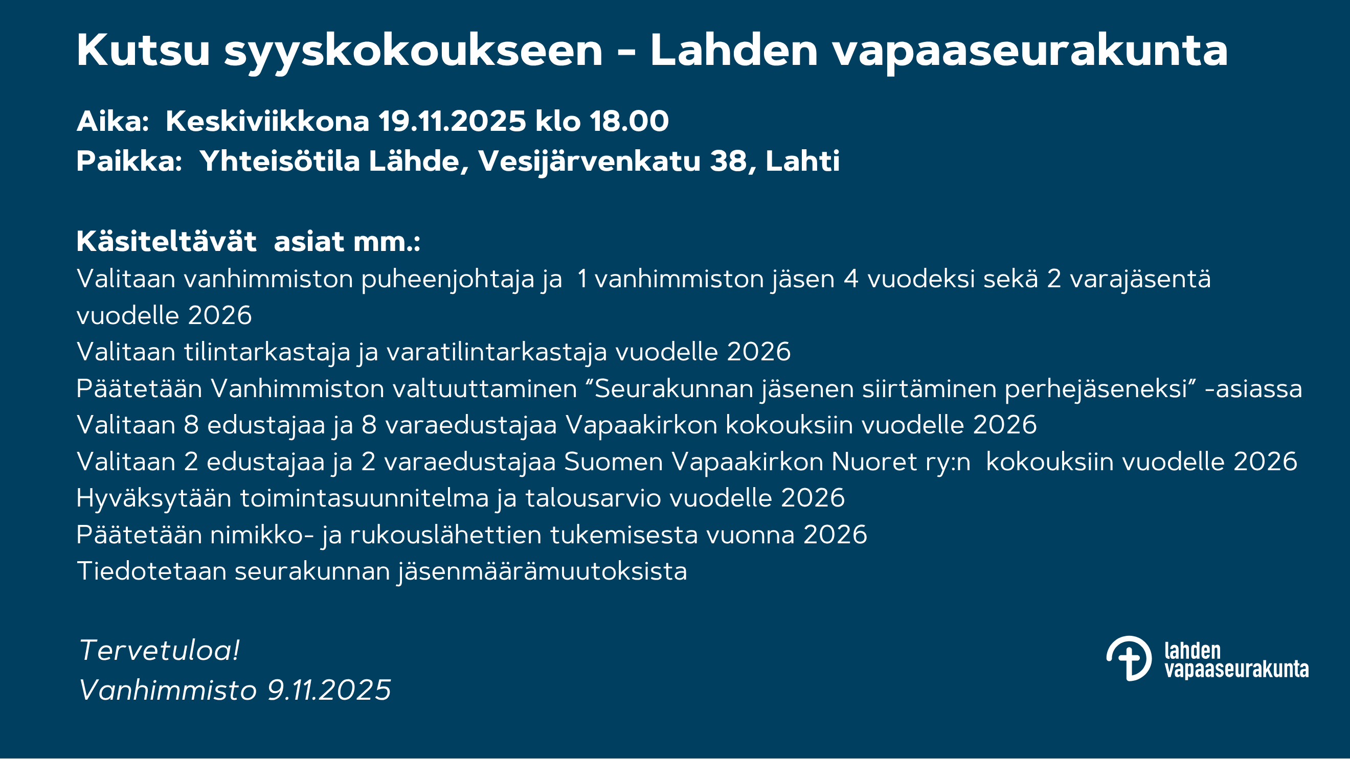 Lahden vapaaseurakunnan syyskokous on keskiviikkona 19.11.2025 klo 18.00 Yhteisötila Lähteellä, Vesijärvenkatu 38, Lahti.