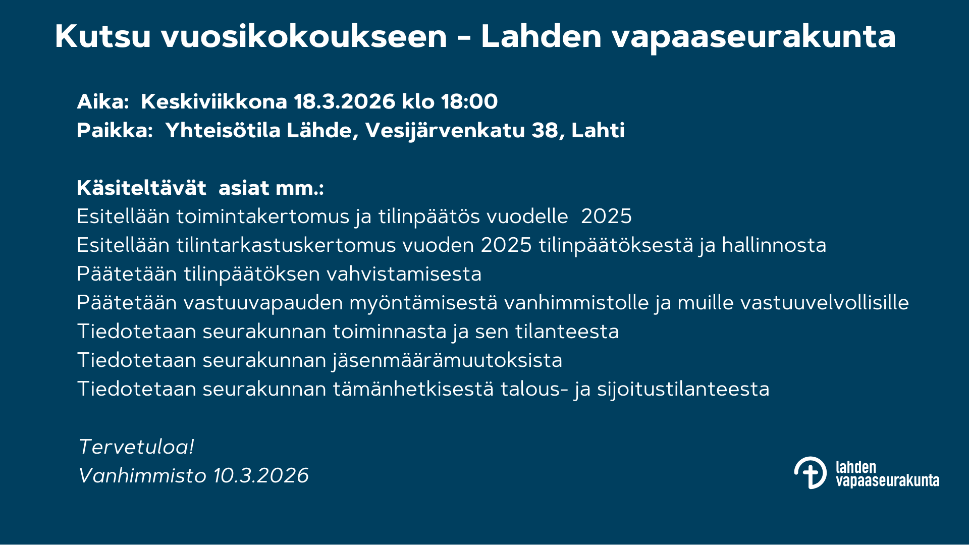 Lahden vapaaseurakunnan vuosikokous on keskiviikkona 18.3.2026 klo 18:00 Yhteisötila Lähteellä, Vesijärvenkatu 38, Lahti.
